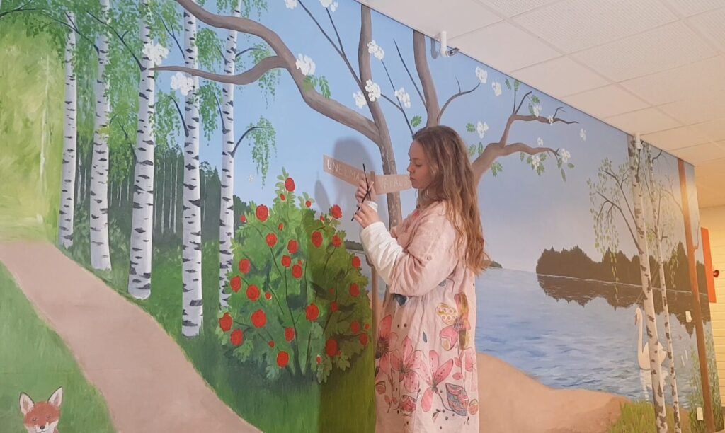 Kaikkein parhaita ovat valtavat maalaukset niitä tehdessä on, kuin olisi osa maalausta tuntuu kuin olisi vapaa sellaisena joksi on luotu, melkein kuin lentäisi. Viime vuoden lopussa sain valmiiksi projektin joka oli kaikin tavoin juuri sitä mitä taiteilijana mieluiten teen “Unelmain säteitä” seinämaalauksen. Kun huoneeseen astuu minusta tuntuu, kuin saapuisin satukirjaan. On suuri etuoikeus saada olla taiteilija tuon nimenomaisen teoksen takana.